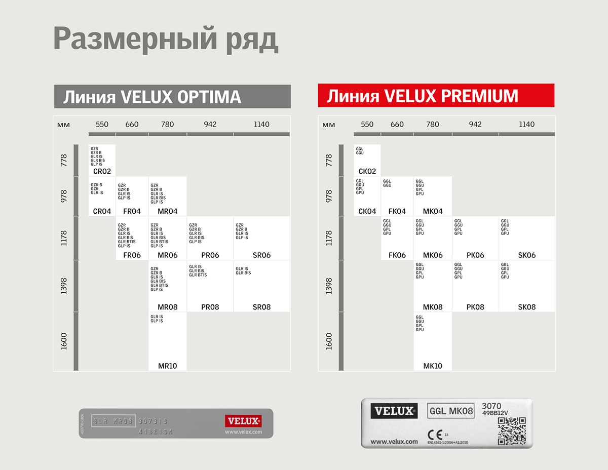 Размерный ряд мансардных окон VELUX
